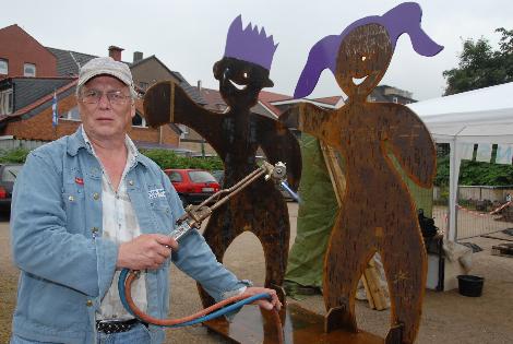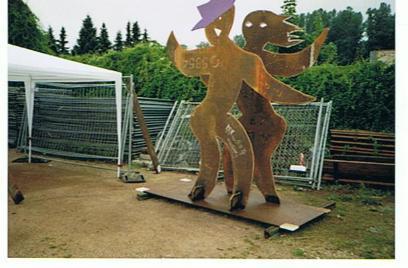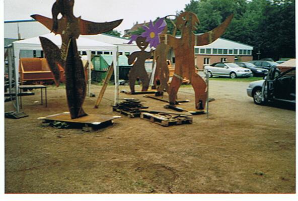 Es mußte ein anderer Standort gefunden werden,um diese Figuren herzustellen . Erst werden die Metallplatten Figurmäßig angezeichnet ; dann mit einem Schneidbrenner ausgebrannt ! Vorhandene Schlacke und Brennerspuren mit einer Flex , die Blechkanten entgratet und geglättet . Die aus mehreren ausgebrannten Teilstücke werden mit einem Schutzgasschweißgerät zusammen verschweißt . Für diese Schweißnähte wurden dementsprechend die Oberflächen mit einer Flex ( Schruppscheibe ) bearbeitet .