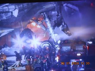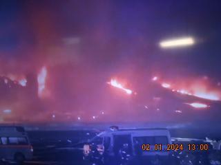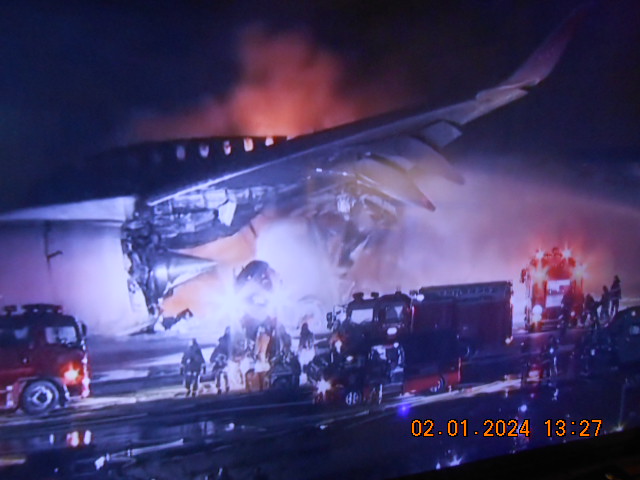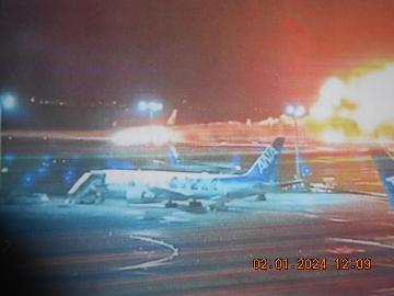 In Webcam Aufnahmen des japanischen Senders nkk ist zu sehen , wie die Feuerwehrkräfte das brennende Flugzeug auf der Landebahn löschen .